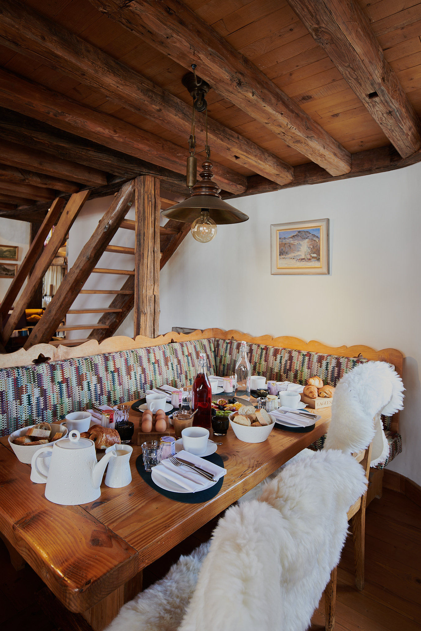 The chandelier defines the dining zone in this open plan studio. The banquette defines a cozy breakfast corner in this chalet.
