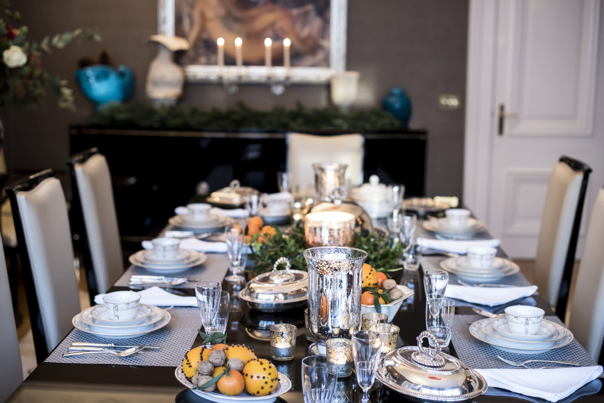 Layering Elements. A truly striking table setting is achieved through layering – combining textures, heights, and elements to create visual depth. I start with a charger plate, followed by a dinner plate, and finish with a smaller salad or appetiser plate. The layered arrangement adds dimension to each place setting. Napkins are an opportunity for creativity. I might fold them neatly for a traditional look, or drape them casually for a relaxed feel. Napkin rings, such as metal cuffs, floral ties, or textured fabric bands, can add a finishing touch. A well-composed centrepiece anchors the table. Low arrangements of fresh flowers, candles, or even seasonal elements like pinecones or citrus fruits add a personal and natural touch. I have to remind my self to keep the height moderate to ensure conversation flows unobstructed. When I entertain larger groups I write place cards stuck into vintage holders , calligraphy is not my strength but at least I use a proper fountain ink pen for a polished look. On tables I like to incorporate nature-inspired accents like sprigs of rosemary, small pumpkins, or seashells depending on the season or theme.