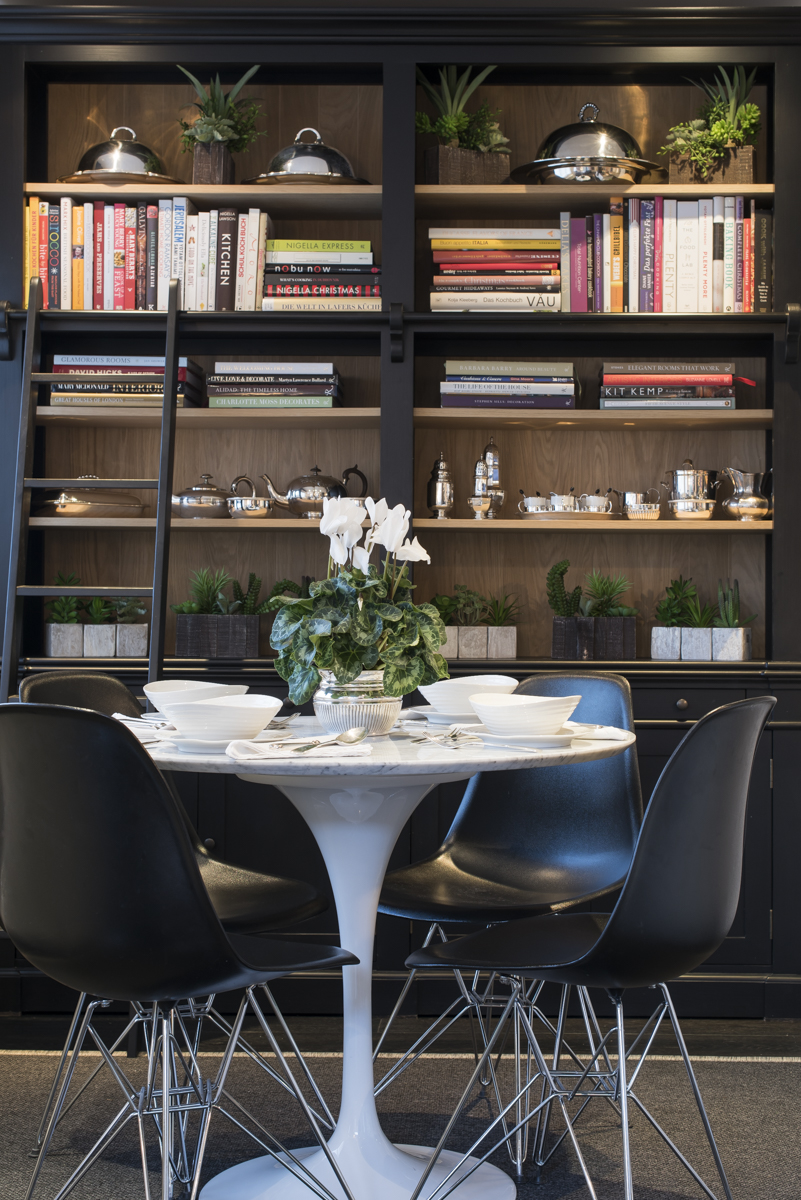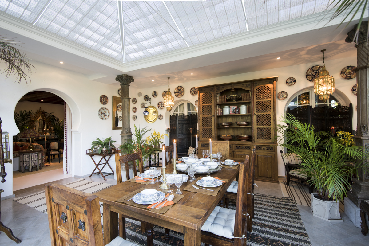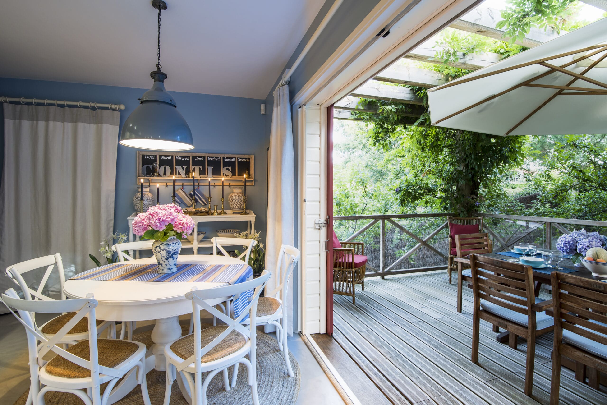 This pretty round painted table is cozy for most days but it has two extension leaves which means it can seat 10 easily when required. Plus the sliding doors give access to a secondary outdoor table for larger parties.