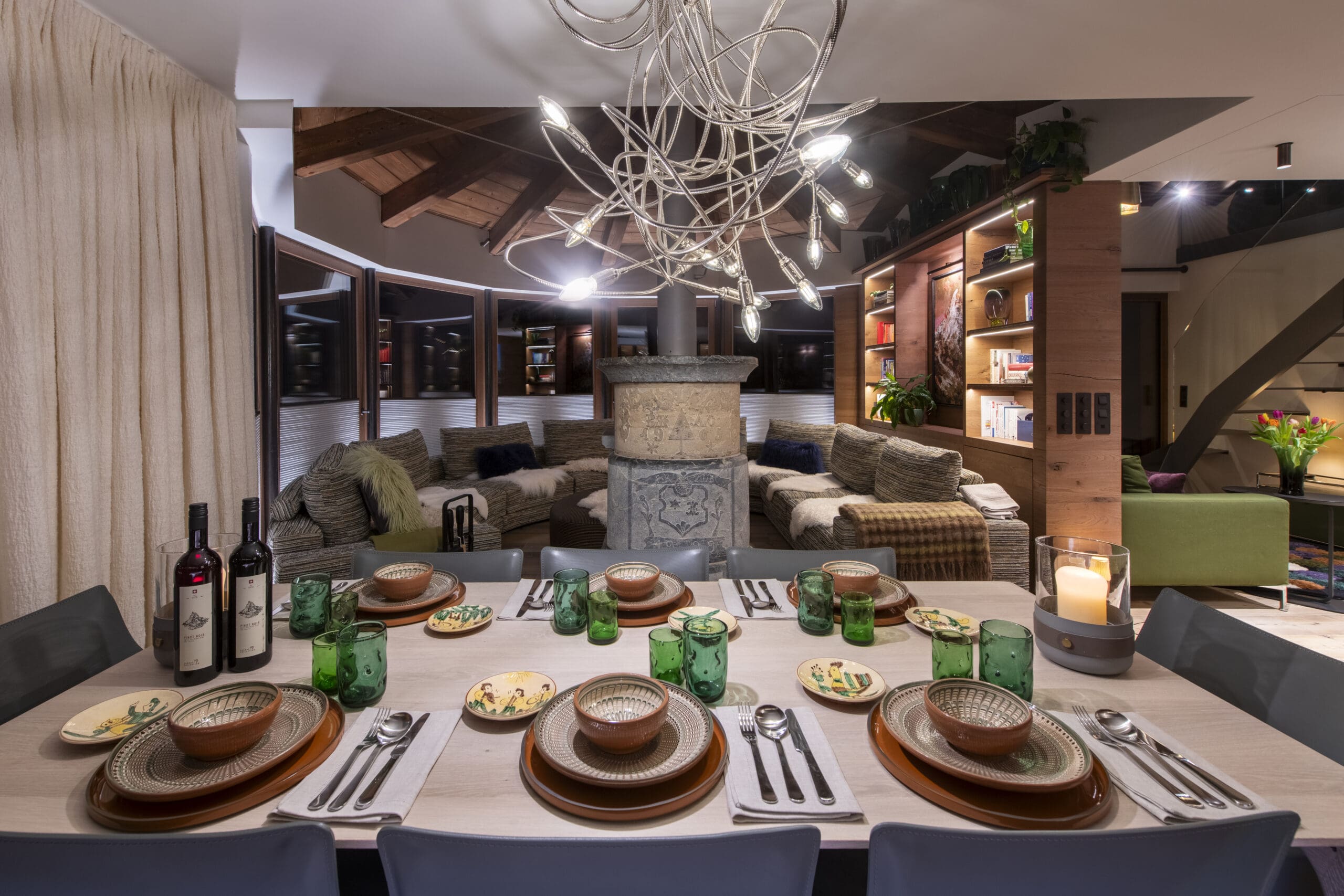 This open plan dining, kitchen, living chalet is zoned with a large stone fireplace and a bookcase wall.