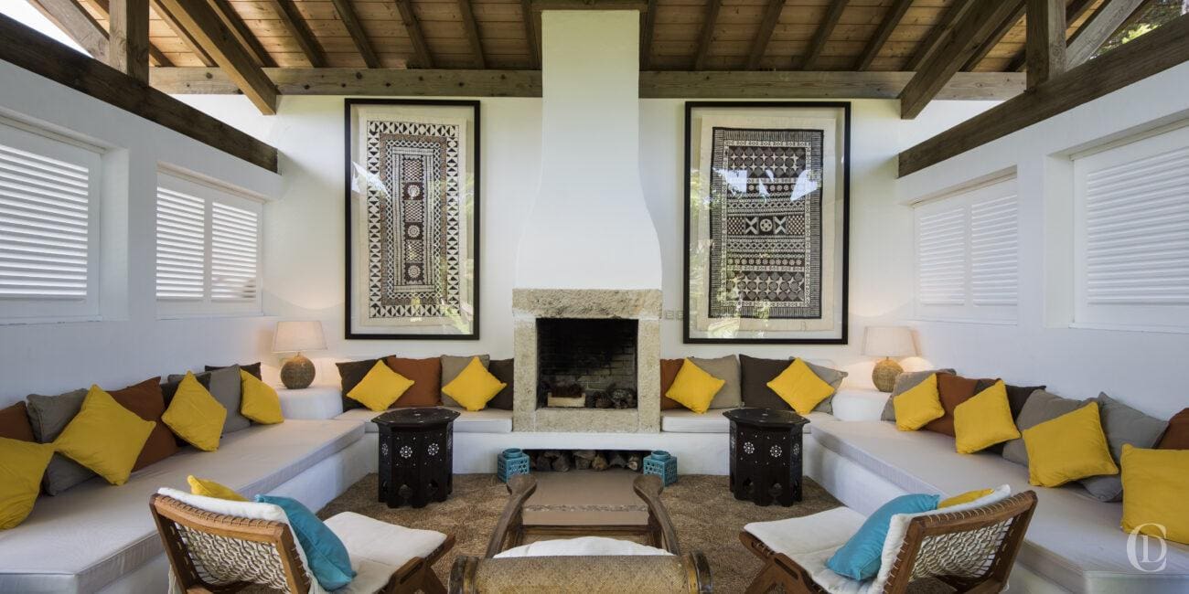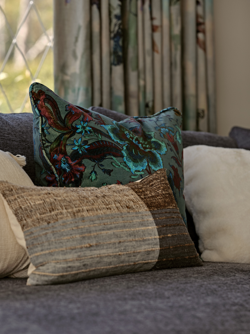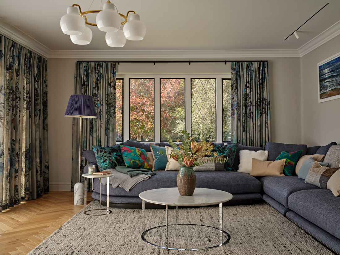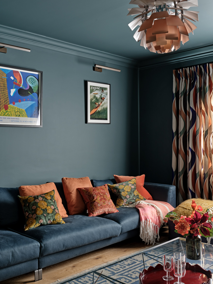 My vision for the movie snug was to create a moody, cocooning den — a place where the children could retreat during large kitchen gatherings, or where the family could curl up together on quiet evenings. To achieve this, I adopted a colour-drenching approach, enveloping the entire space — walls, woodwork, cornices, and ceiling — in a rich, deep petrol blue. This immersive treatment blurs architectural lines, enhancing the room’s intimate atmosphere. A large contemporary corner sofa, upholstered in a textured fabric precisely matched to the wall colour, seamlessly blends into the architecture, allowing vibrant cushions in shades of orange and red to punctuate the scheme with warmth and energy. Unlike the rest of the house, which called for maximising natural light, here we dressed the large window with heavily embroidered curtains, thinly lined to create a soft, dappled glow that enhances the room’s enveloping character. For lighting, we deliberately kept things minimal. Picture lights and modern pendant are the only source, gently illuminating artworks chosen to complement and deepen the palette, reinforcing the snug’s intimate, cinematic feel.