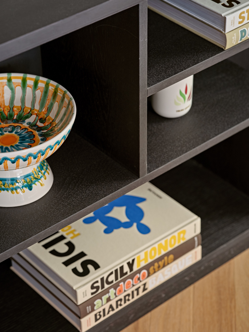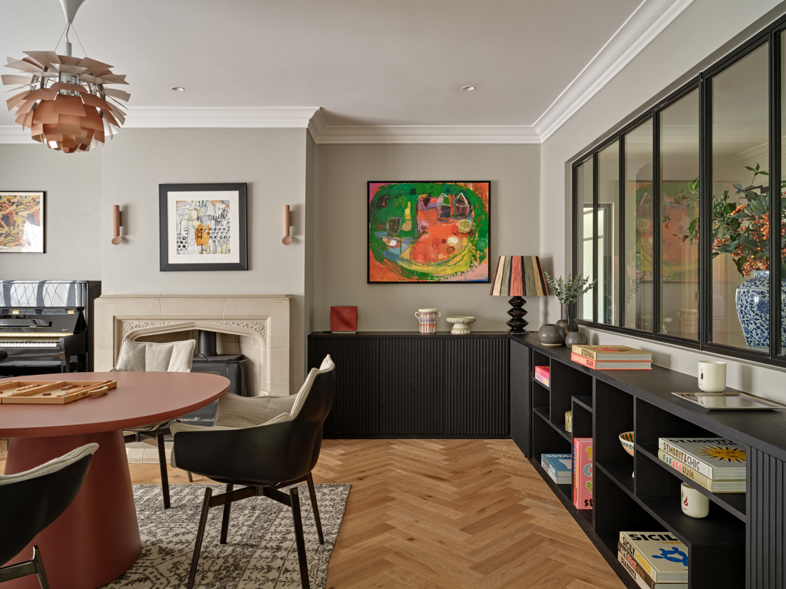 We developed architectural and interior concepts for the two rooms leading off the kitchen. My vision for the library was to create a space that feels both intimate and expansive, a place where function and family life flow together effortlessly. The moment you arrive in the entrance hall your eye is drawn to the vast window framing the library drawing you eye beyond to the garden. This new opening floods the entrance with natural light and offers a glimpse of the sanctuary space. Originally, this room had three access points—from the entrance, kitchen, and terrace—but we chose to simplify it. By closing two of the routes and introducing a pair of large double doors in perfect symmetry with those leading to the family snug, we transformed the library into a calm, quiet retreat that still feels bright and open. We retained the original fireplace and garden window but reimagined everything else. Our studio designed all the built-in cabinetry in black oak to mirror the seamless aesthetic of the kitchen, combining open and closed units to elegantly balance display and storage. As a parent of three daughters, I know how family life can spill into every corner—papers, toys, games—and this thoughtful design provides space to tuck things away while still celebrating books and beautiful objects. The large table near the kitchen makes this room incredibly versatile: close enough to the heart of the home for easy access, yet separate enough to offer a peaceful spot for homework, quiet reading, or simply leaving a puzzle or project mid-flow. Where there was once a terrace door, we’ve created the perfect corner for the family’s piano—a nod to their love of music and a reminder that this room, like any well-loved library, has many roles to play.