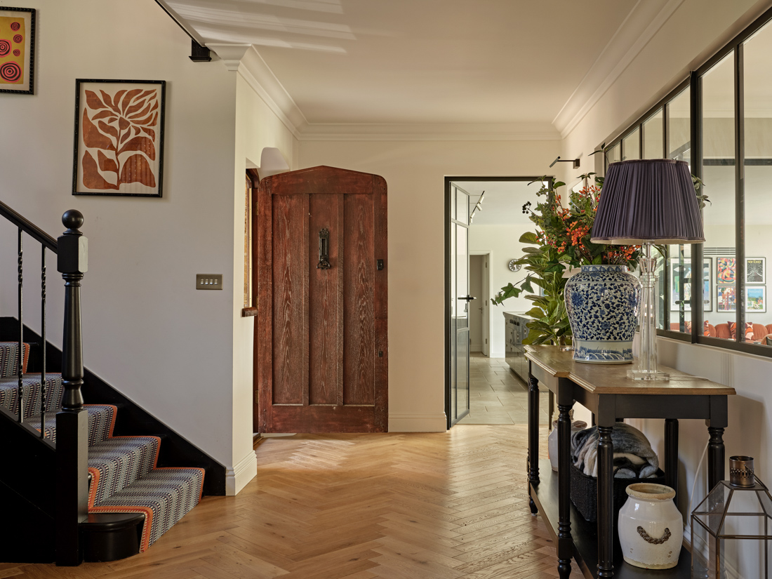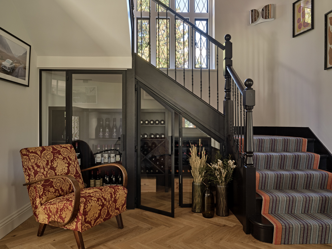 The staircase underwent a complete transformation. Previously dominated by a solid, heavy banister, it now features slender metal spindles that echo the Crittall detailing, creating an open, airy feel. Beneath the stairs, a former storage cupboard was removed and replaced with a bespoke glazed wine room, extending the modern glass theme in a functional yet striking way. To complete the transformation, we introduced a colourful stair runner that weaves together the key hues of the decorative scheme, bringing warmth and personality to the hallway.