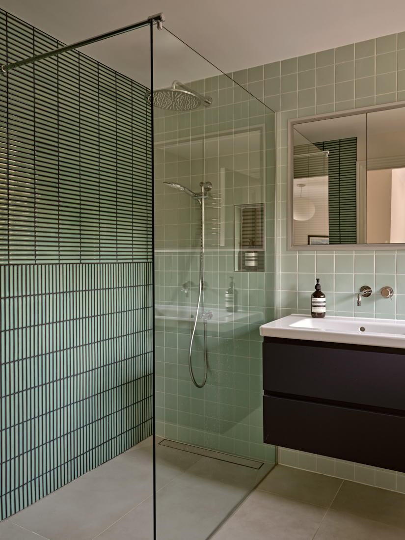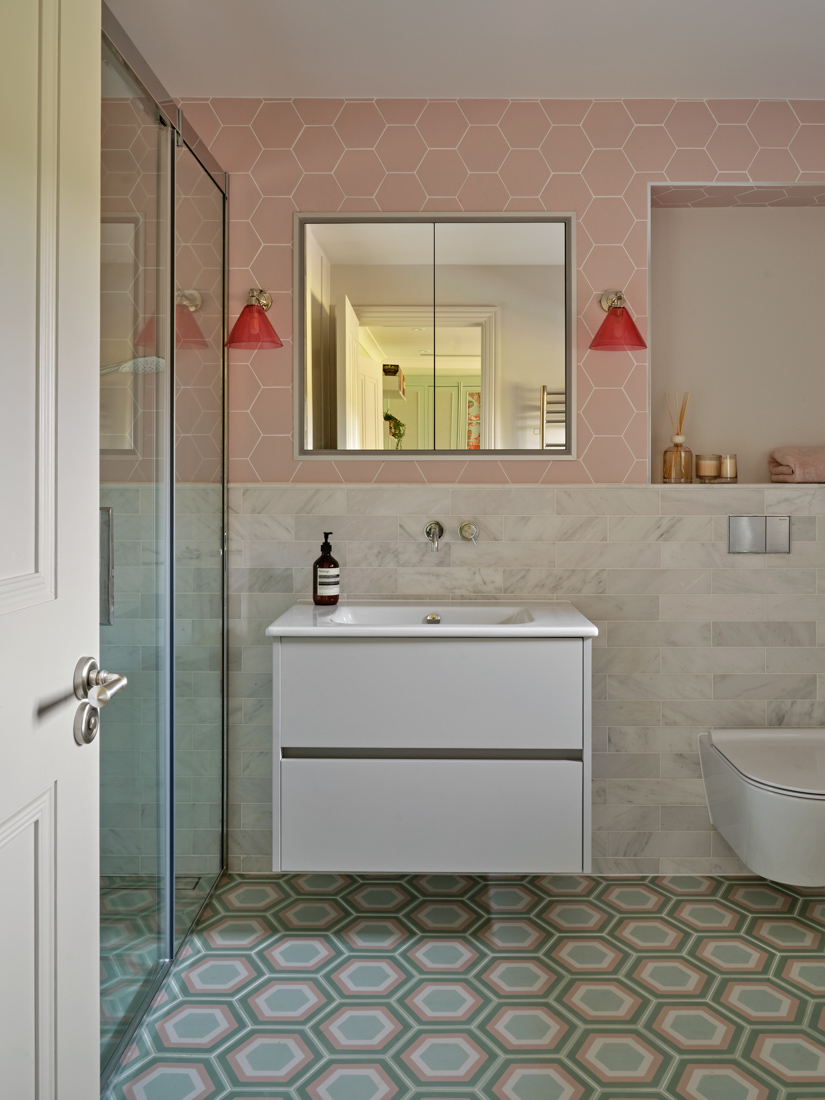 The first floor features five generous ensuite bedrooms, along with two additional bath and shower rooms serving guests and the gym. The clients envisioned modern, colourful, and textured bathrooms, each with its own distinct palettethat complements its adjoining bedroom, while experimenting with new materials and finishes. The challenge lay in achieving a sense of harmony and continuity, despite using a different tile scheme for each room. Drawing on our extensive network of suppliers, we crafted seven unique bathroom designs, combining real and imitation marble, onyx, natural stone, zellige tiles, and printed porcelain. Each space carefully balances colour, texture, and scale, resulting in a rich yet cohesive collection of rooms. The bedrooms were designed to echo and complement their respective bathrooms, using paint, wallpaper, bespoke joinery, fabrics, accessories, and modern lighting to create individual identitieswithin a unified scheme. Soft shades of greens, blues, and pinks, layered with neutral tones, bring a sense of calm, character, and quiet luxury to these private spaces.