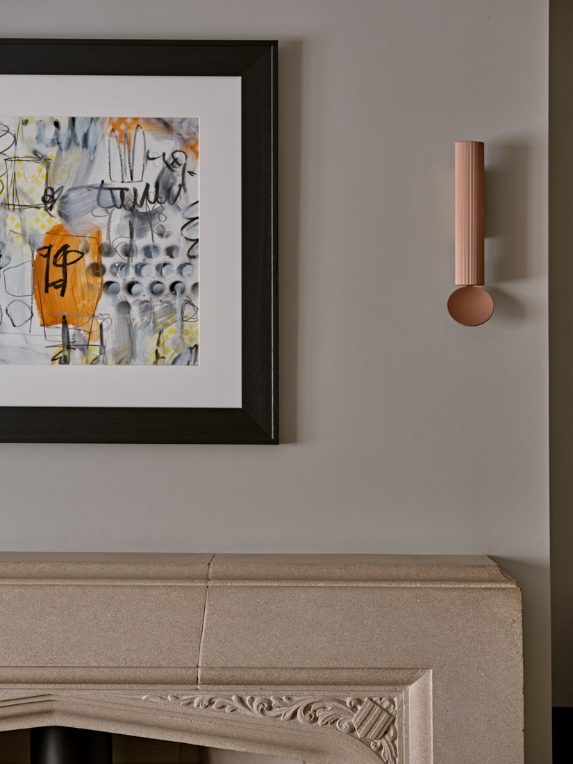 Lighting transforms any interior and this house gave us the opportunity to really show off all the different ways we can employ lighting while minimising the use downlights. In the hallway and staircase,  which was the worst part of the house to begin with, we rewired entirely and installed six different circuits. We have a pair of deliberately not matching table lamps on 5amp circuit. There are tiny uplighting floor spots integrated in the new herringbone parquet together with LED strips which illuminate the new wine display. We joined up two different types of wall lights on one circuit  – picture lights for the artworks and two modern bold scones in the curved staircase walls. Overhead we have a big statement modern chandelier by Flos which lights up the upper and lower floors. Lastly we recessed tiny square LED floor washers just above the skirting on each third tread and they give a soft glow to the runner. All other rooms were fitted with predominantly pendants and wall lights, all chosen from modern Italian brands to juxtaposition the classic architecture of the facade.