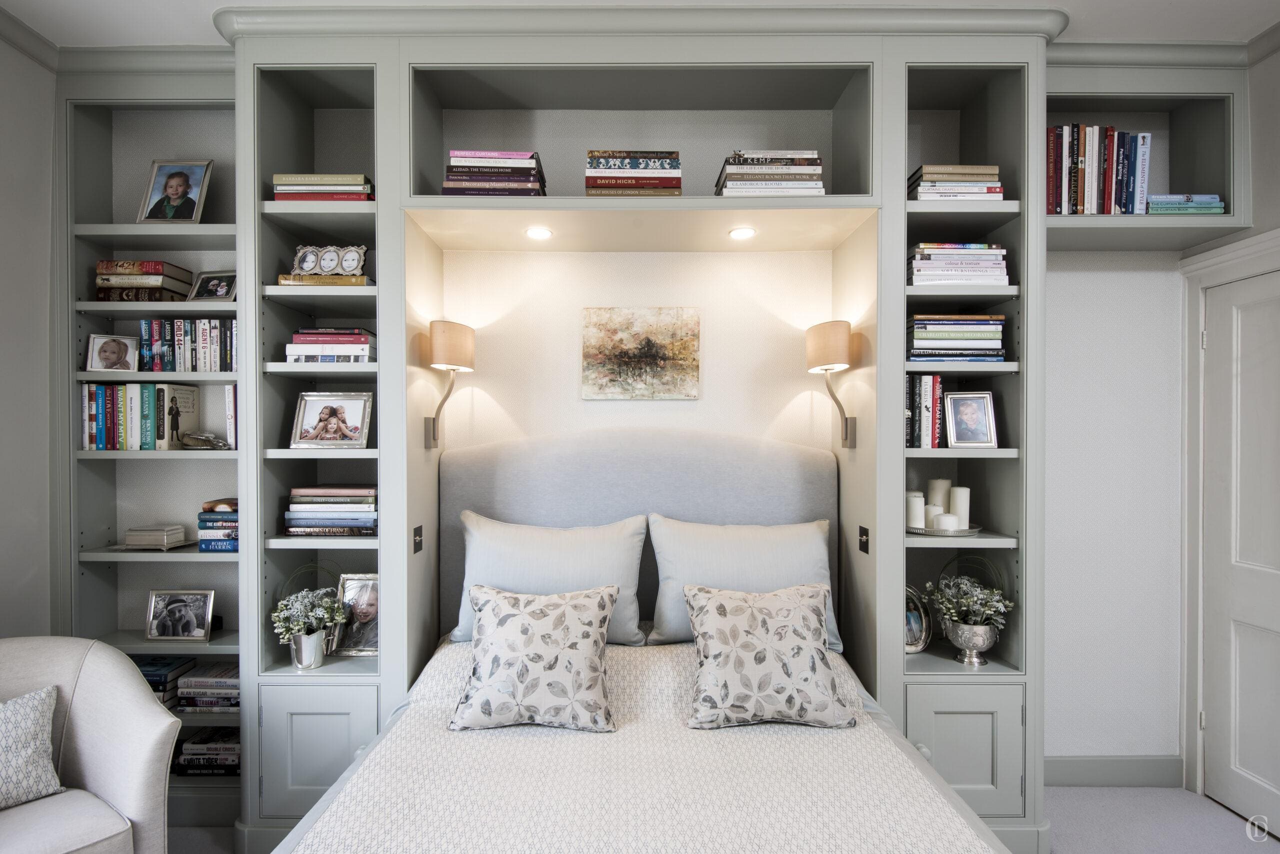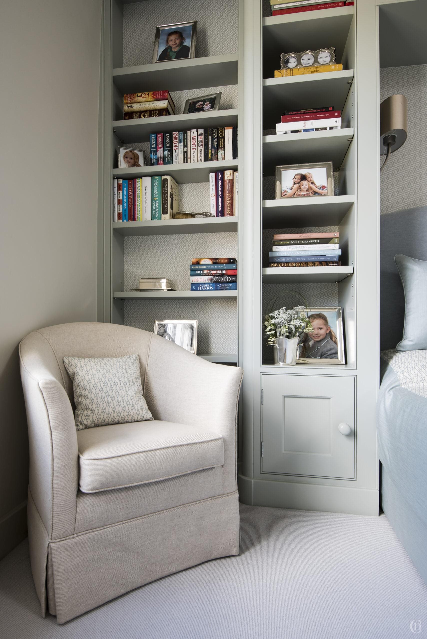 The clients asked for calm soothing colours to blend well with the rest of the Georgian property. We devised a scheme for all the spaces on this floor to transition smoothly. The style of furniture and all the fittings, sanitaryware, textures and fabrics exude a timeless and classic, informal elegance. We used a subtle palette of greys, greens and green blues on paint, wallpaper and fabrics which we applied to both bedrooms, dressing room and bathrooms. Besides the reconfigured floorplan the second major element was the bespoke joinery design. Installing large expanses of painted surfaces can make rooms ‘cold’. To balance the impact of the joinery and soften the spaces we introduced other materials ; a mixture of fabrics including wool, linen and mohair ; walnut veneered internals for all wardrobes; wool carpet; we lined the backs of the bookcases with wallpaper. The bathroom features wood effect tiles, a beautiful speckled limestone and a glass mosaic in the shower.