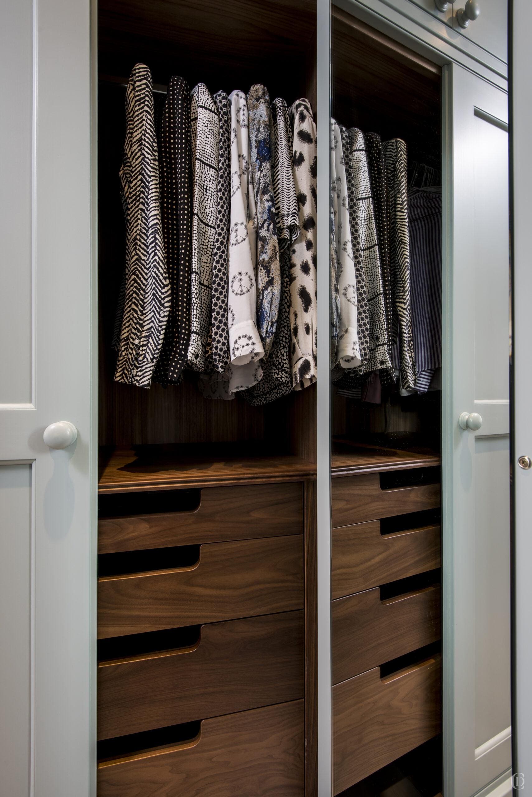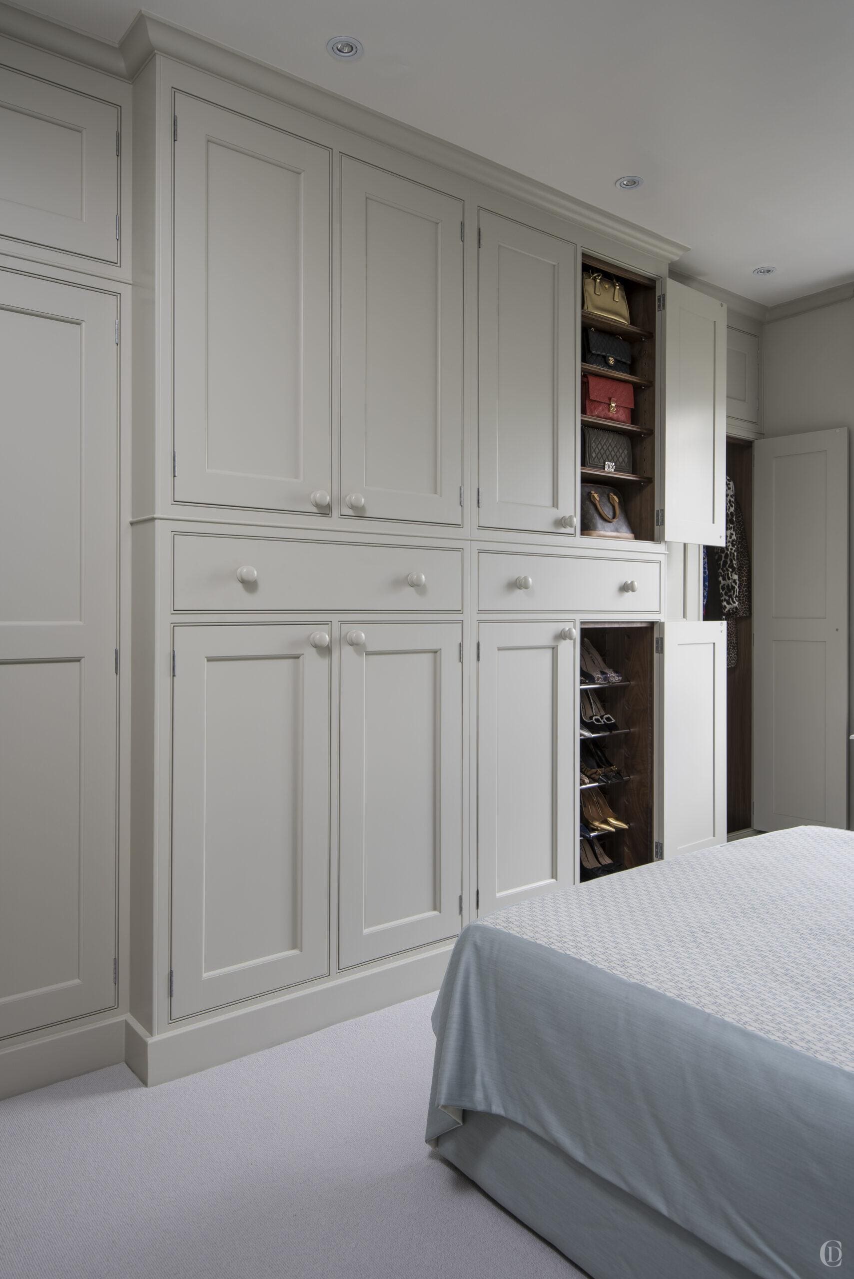 We worked with a wonderful joinery company to realise our vision where the units are constructed in such a way as to allow the internal configurations of the wardrobe’s maximum storage capacity. We used a combination of different sizes of drawers, hanging rails and shoe racks.
