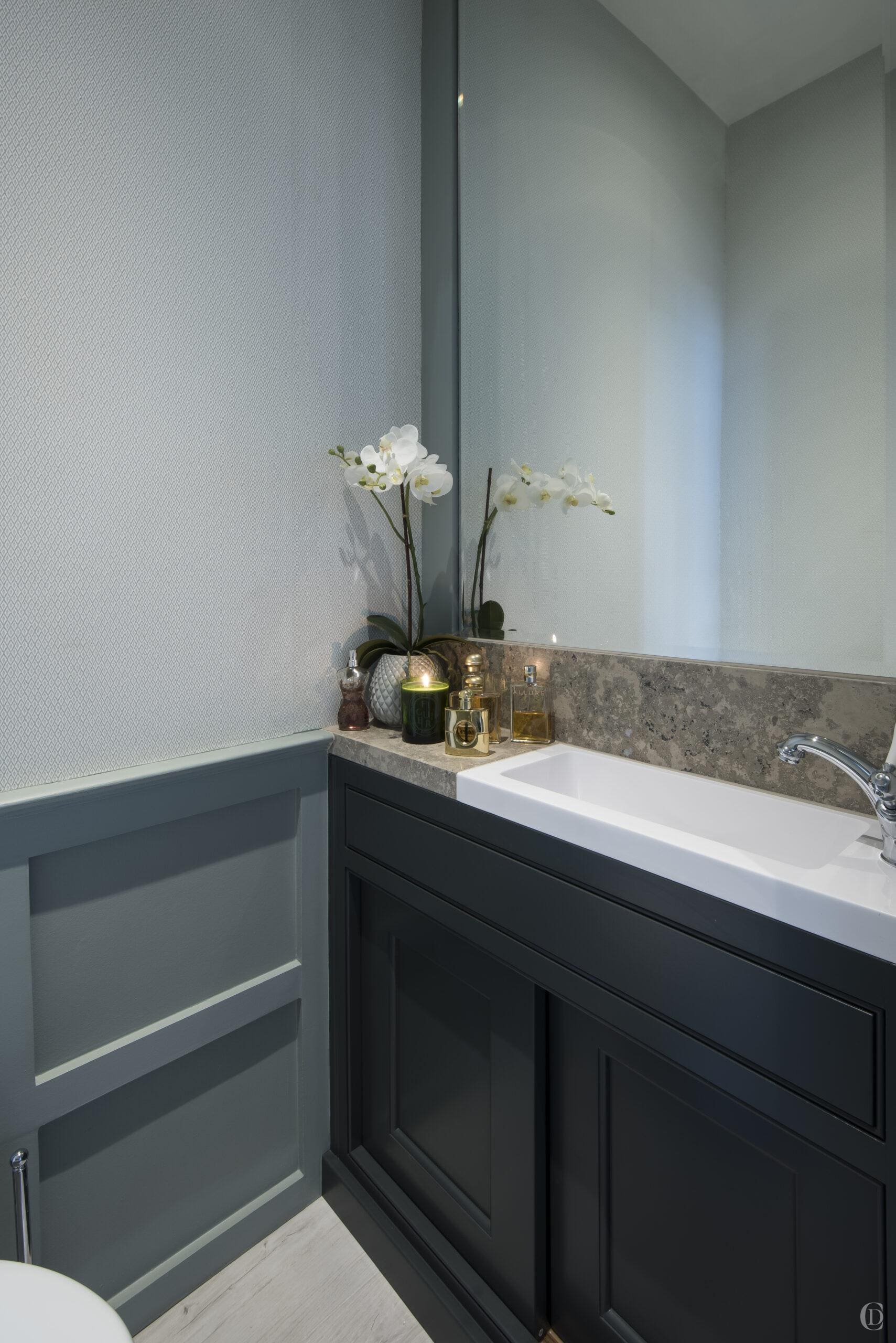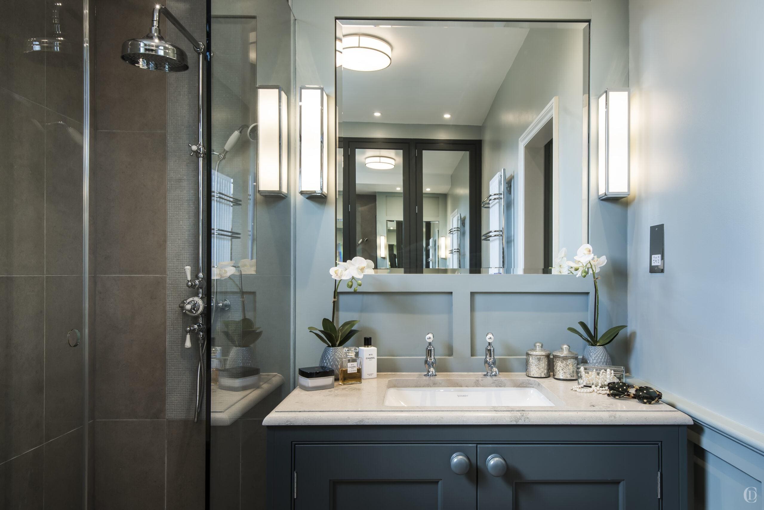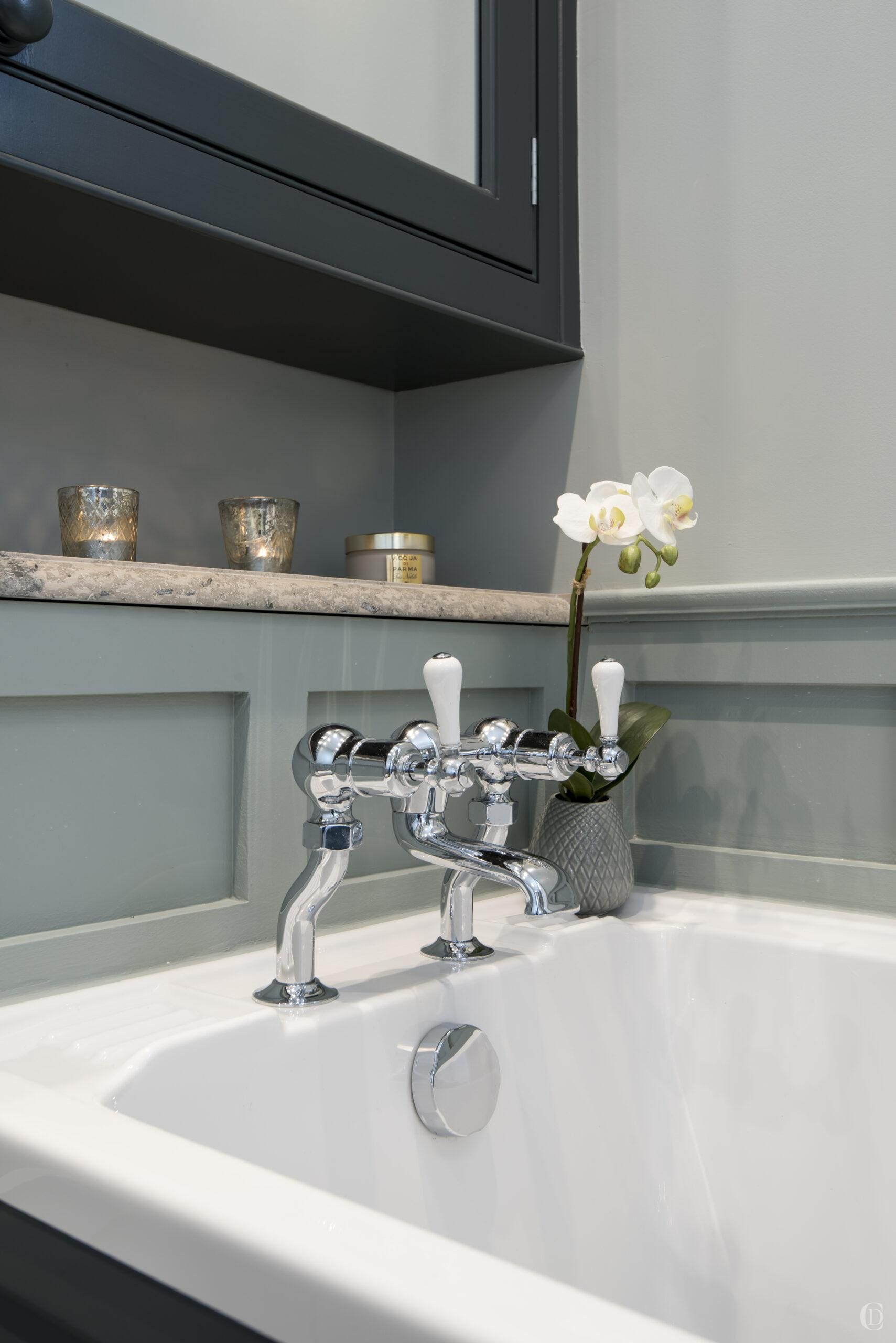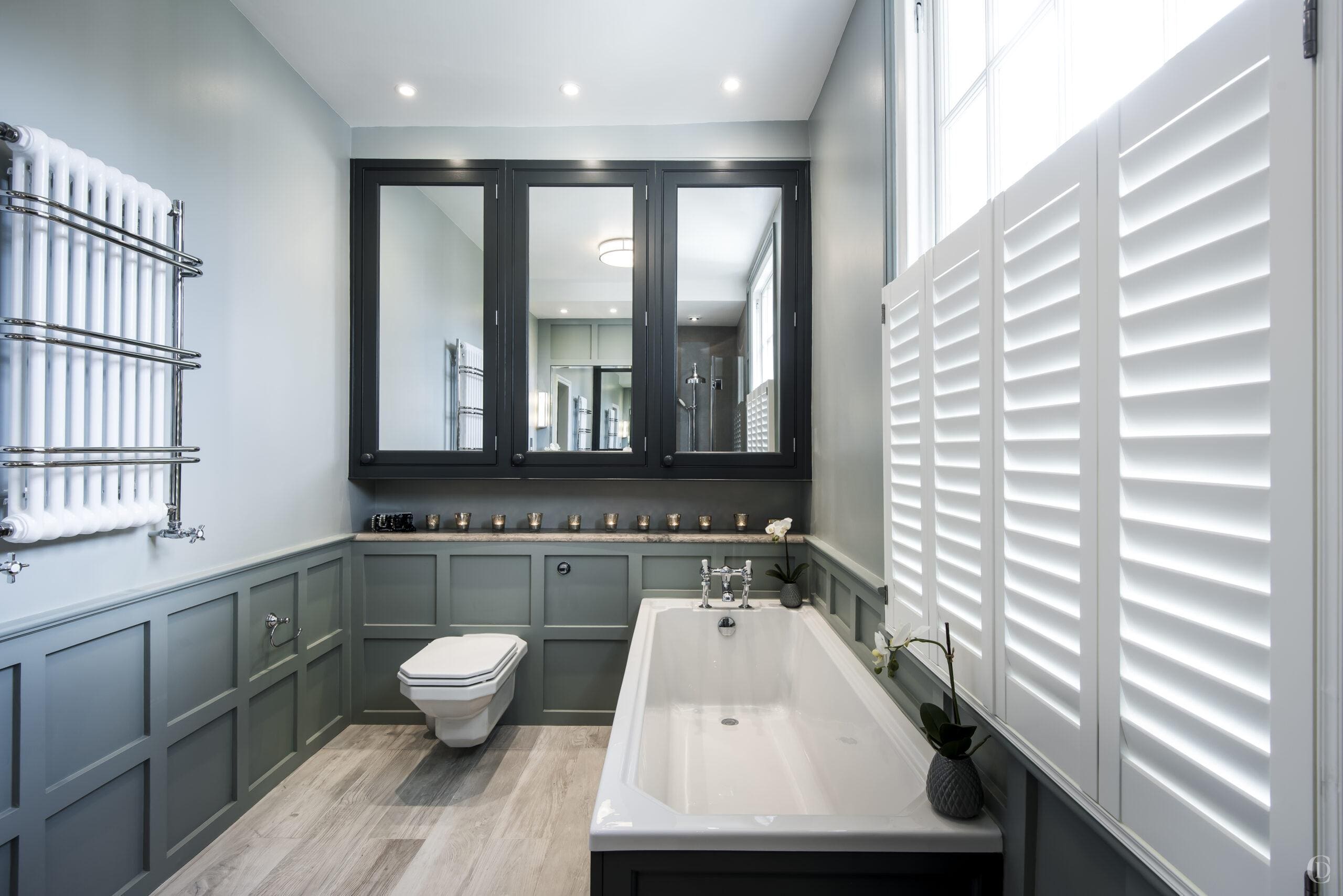 The crucial design feature of the bathroom is the wall panelling – this clever visual trick allows us to break down limited wall space into numerous smaller spaces which then visually makes it appear larger, it’s a very clever decorative device for limited spaces.