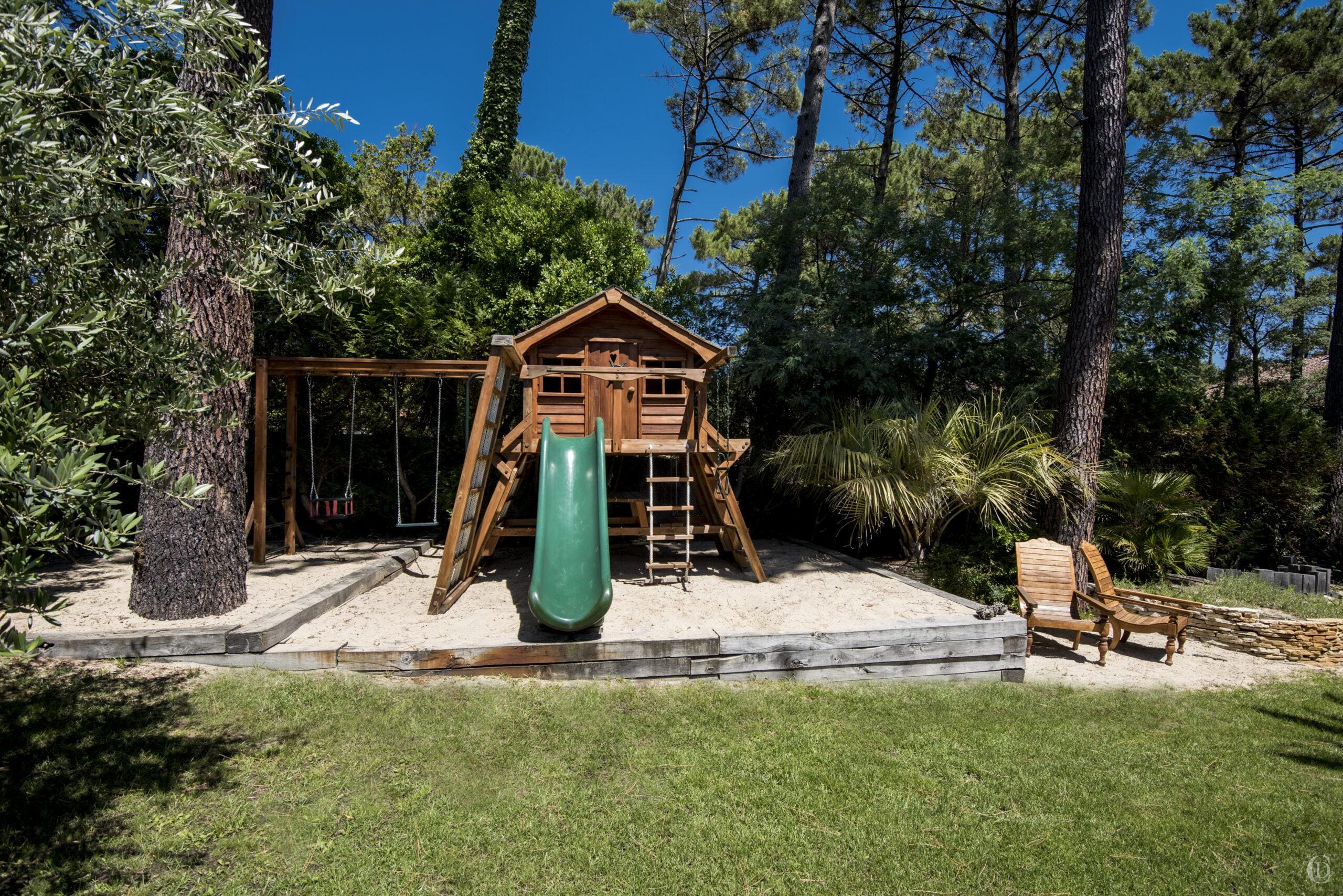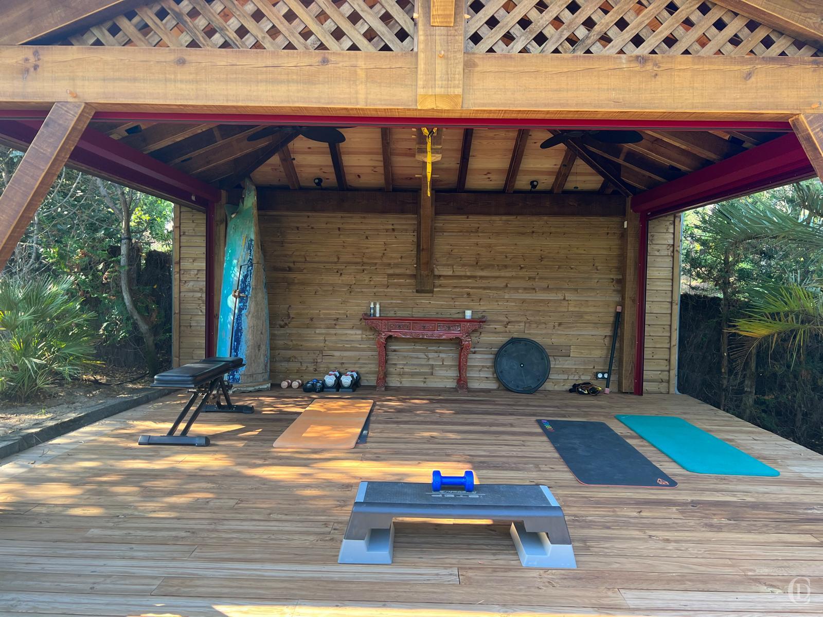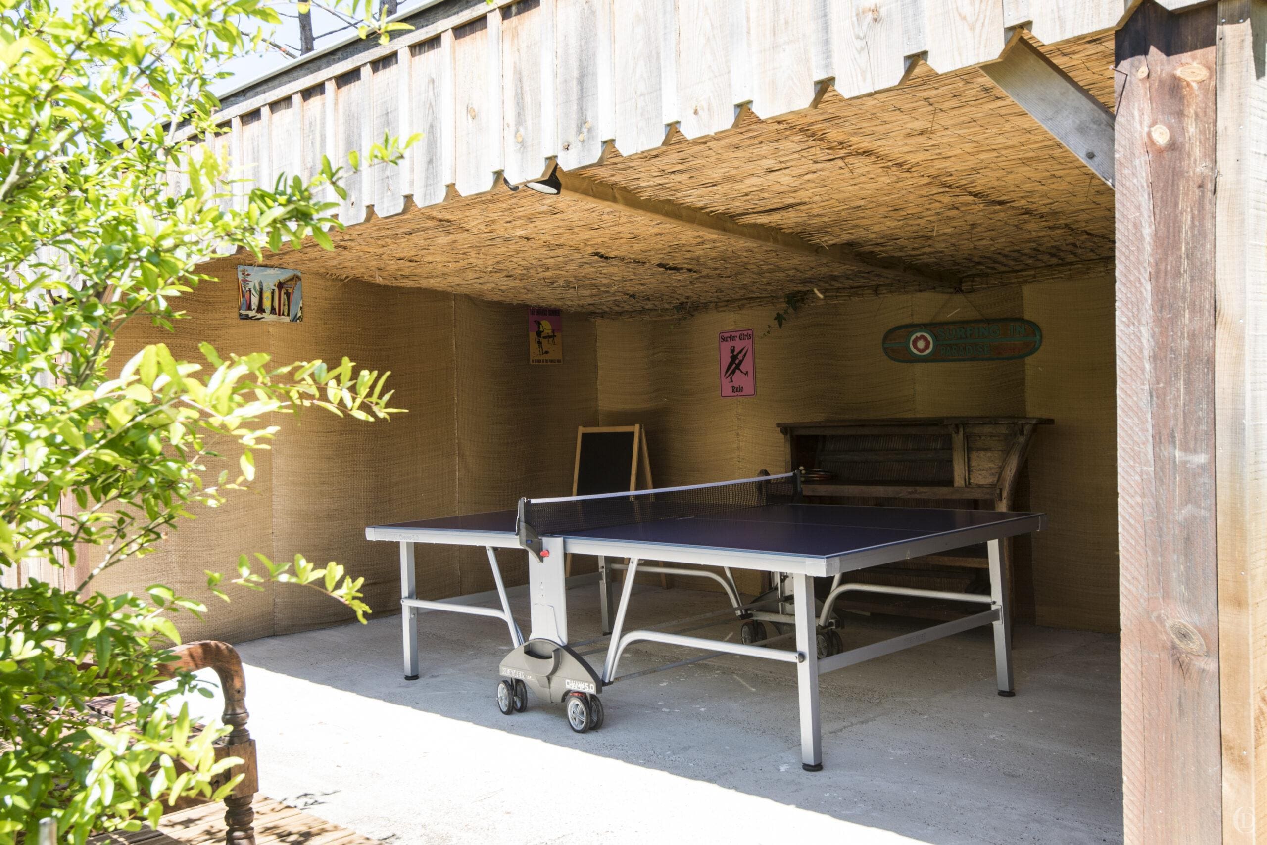 The estate is large enough to build numerous outdoor structures and we worked with a local architect, their topographical survey and a garden designer to determine the layout. The requirement was that guests can eat, swim, play, rest, exercise and roam around the grounds in smaller groups and there should be enough spaces in the sun and the shade so that one can always be together or have some quiet time alone. The garden now offers a playground for little ones, a table tennis hut with games and seating for teenagers and a yoga gym for the adults.
