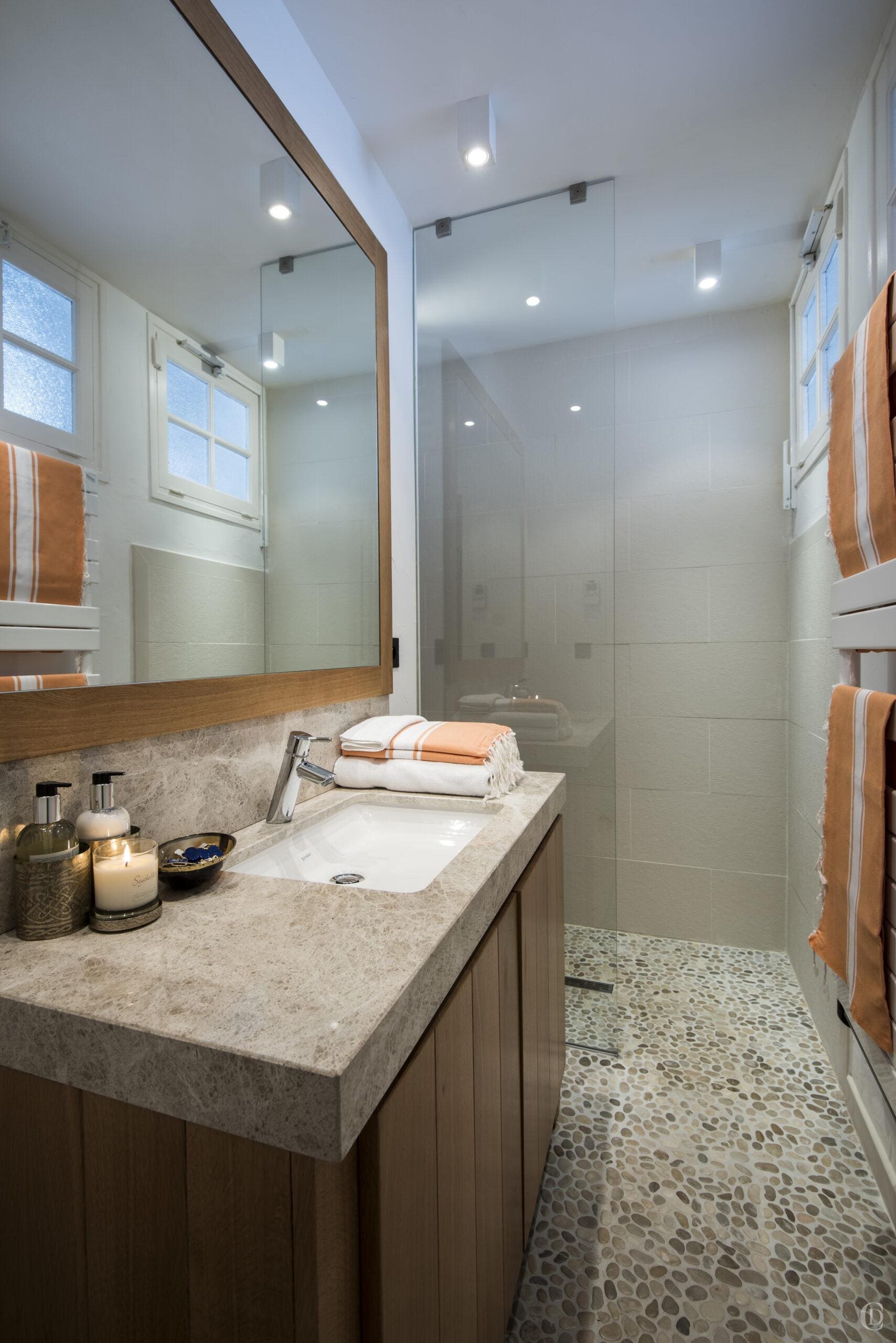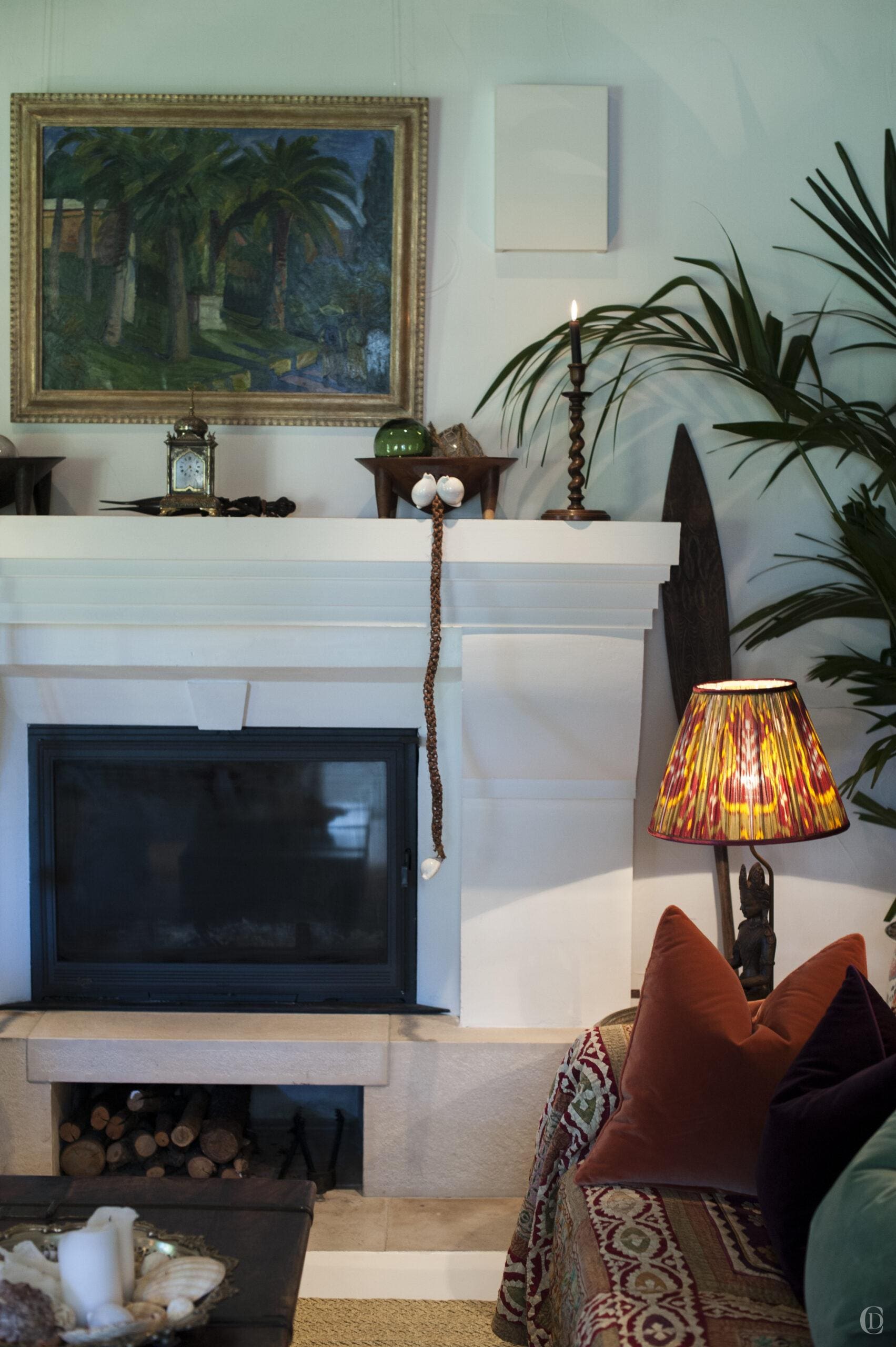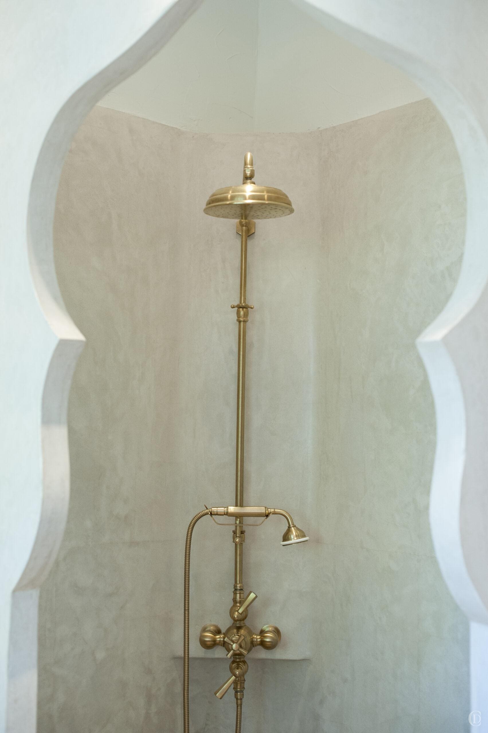 Our vision to create an entirely different sensory experience and to be transported into another world had to encompass very aspect of the finishes, fixtures, materials, colours and furniture. The floors are a mix of wooden boards, tumbled limestone and white painted concrete with plenty of rugs dotted around the rooms for laying of texture and colour. The walls are plastered with rough textured lime wash affects and all corners, windows, door openings are rounded and shaped. The bathrooms are clad in a mix of marble, pebbles, zelliges imported from Morocco and traditional tadelakt. The original fireplace was reclad in plastermoulding to create an entirely new effect. The original ceiling beams were stained dark to work with the traditional dark timber furniture which we sourced and commissioned.