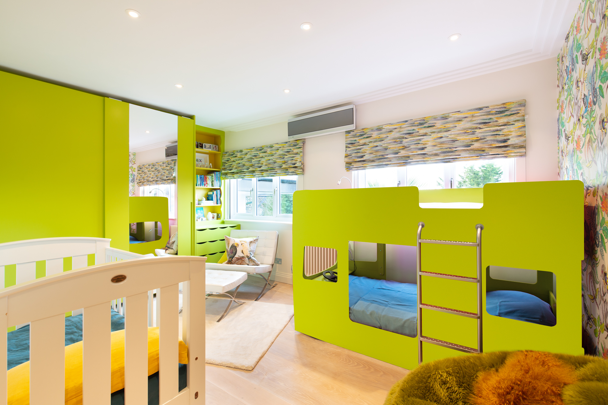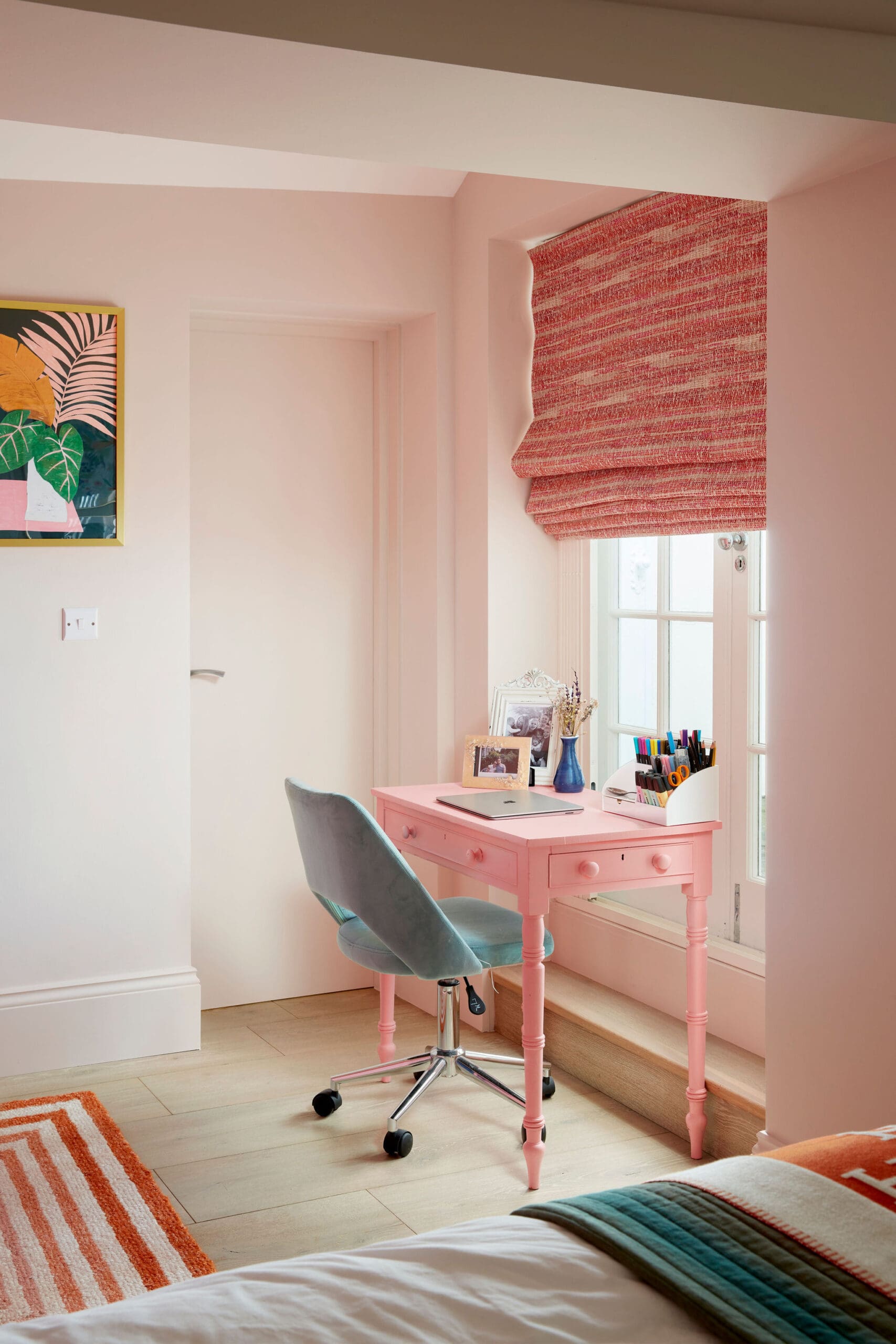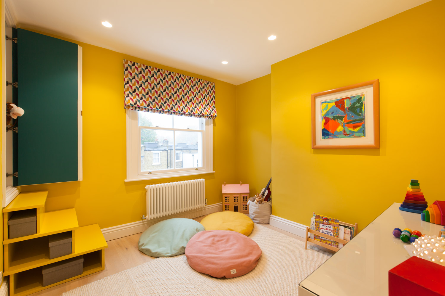 Window treatments play a vital role, especially in the early years — I remember my daughters needing their rooms to be completely dark in order to sleep. For that reason, I always prioritise effective blackout solutions, often using discreet roller cassettes hidden within the window frame. Once the functional layer is in place, I like to dress the window with Roman blinds. They bring texture and charm without overwhelming the space, take up less room than curtains, easy to operate and can be easily updated as the room’s theme or colour palette evolves.