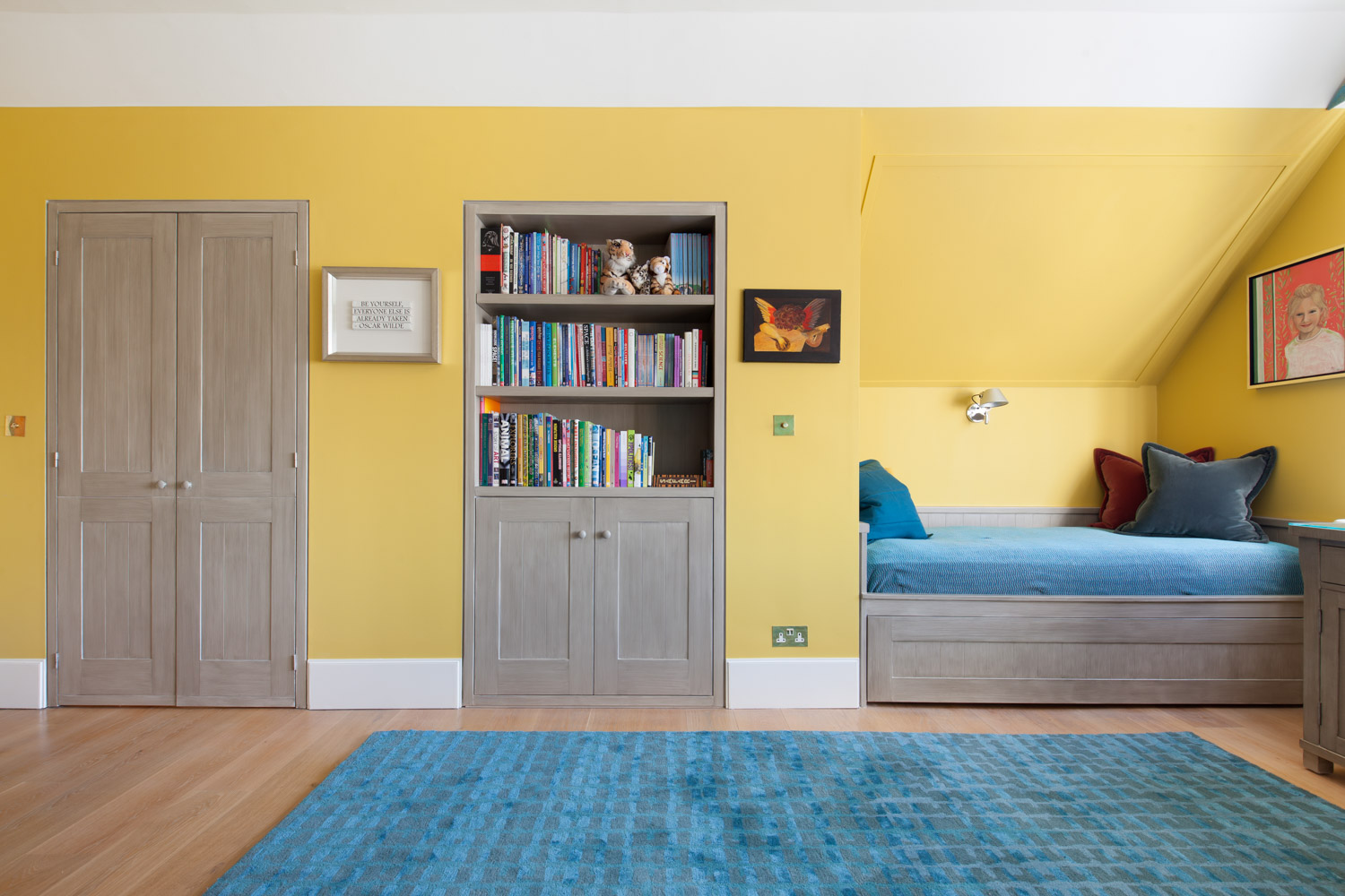 Once the foundation is set, bring in colour and character through easy-to-update accessories: playful pillows, vibrant rugs, or colourful wall art. This way, when preferences inevitably change, the room can evolve without requiring a full redesign.